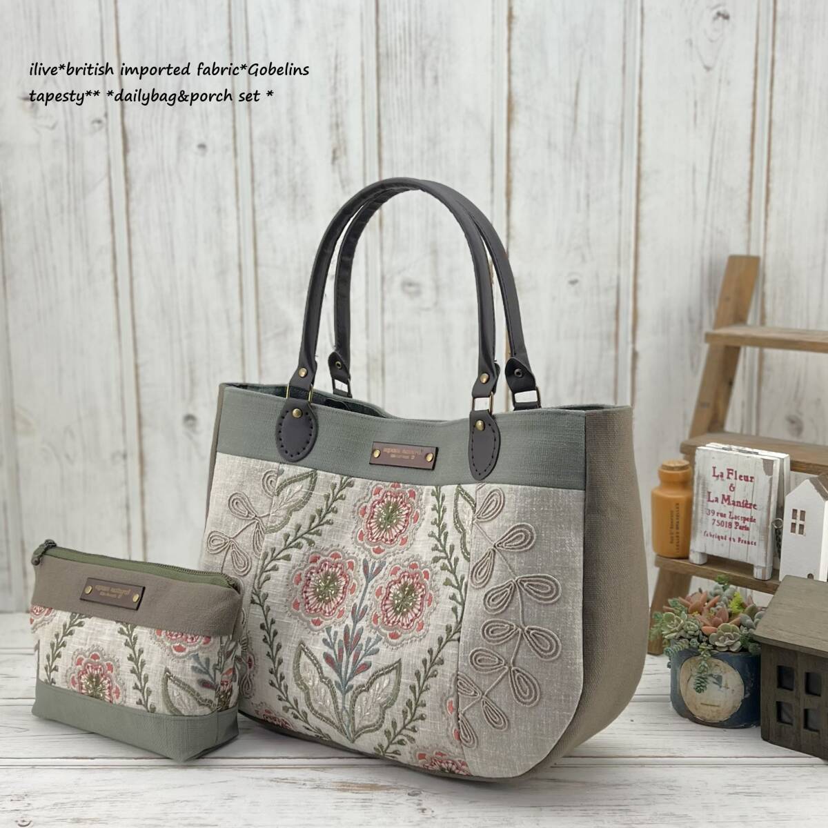 - イギリスインポート*お花刺繍*ロープ刺繍*春*くすみグリーン×ピンク*軽量バッグ*お揃いポーチセット