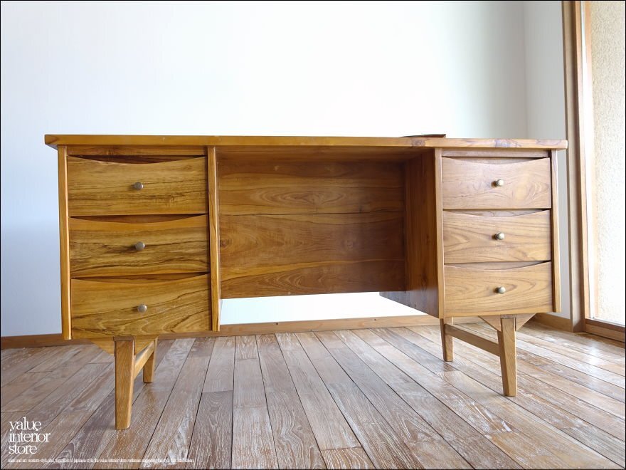 > 1円~ 「 訳あり 」チーク無垢材 両袖机 対面型デスク パソコンデスク 書斎机 学習机 ナチュラル 世界三大銘木 無垢材家具 傷物 B品 キズ物