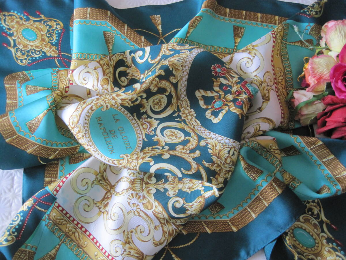 - ★日本製・GRAND EQUIPAGE・大判シルクスカーフ・約87cm×90cm・ビリジアンG×エメラルドG×ゴールデンイエローなど・送料185円★