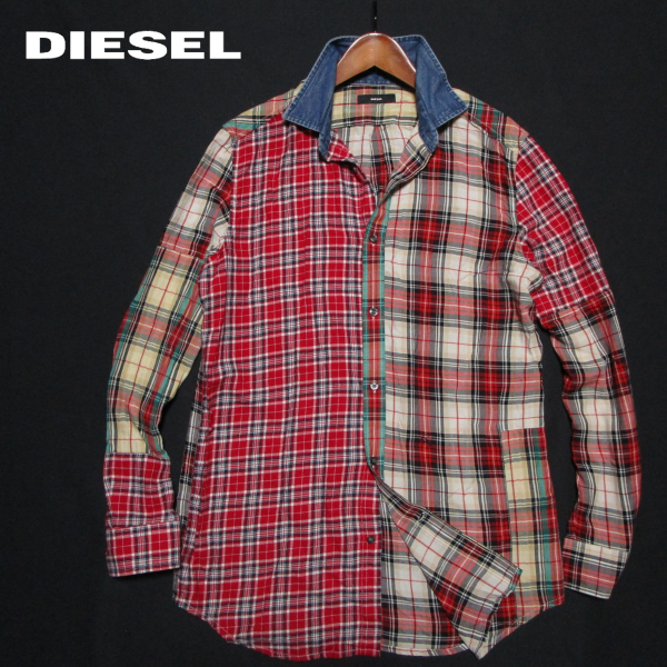 > 【ディーゼル】 クレイジーチェック 長袖シャツ デニム衿 レッド系チェック 長め丈 サイズL DIESEL ディーゼルジャパン
