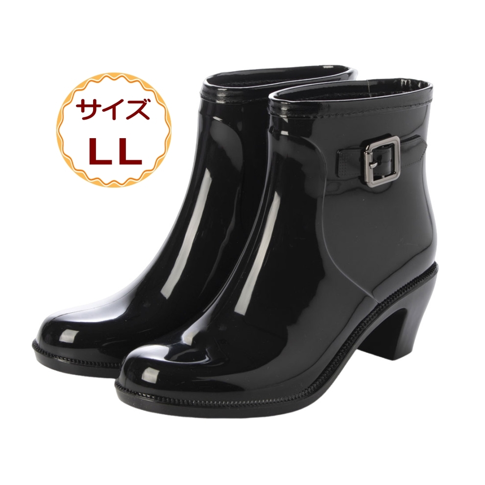 > レディース ショート レインブーツ レインシューズ バックル ベルト チャンキーヒール 完全防水 防滑意匠 婦人 黒 ブラック 24066-blk-LL