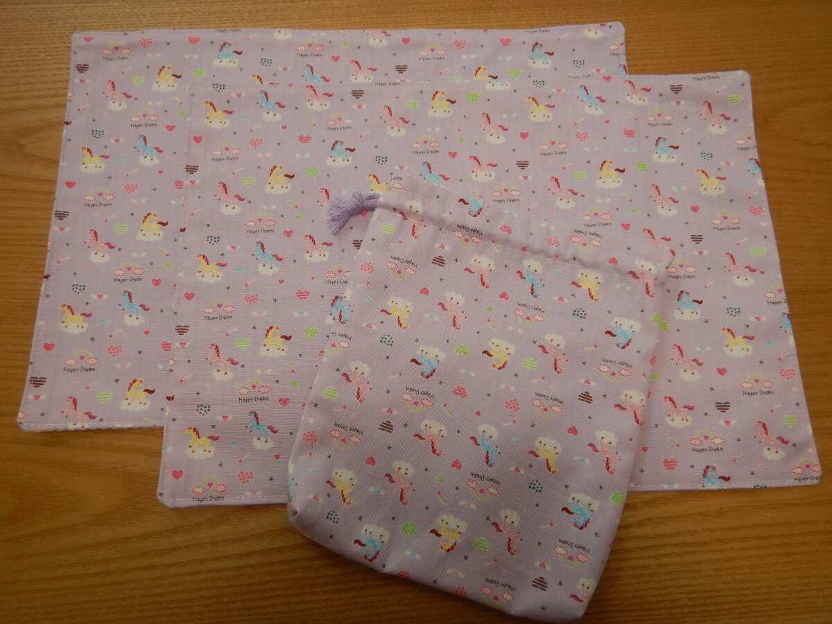 - ハンドメイド ランチョンマット コップ袋 セット 幼児 女の子 ユニコーン柄 カラフル 入園入学準備