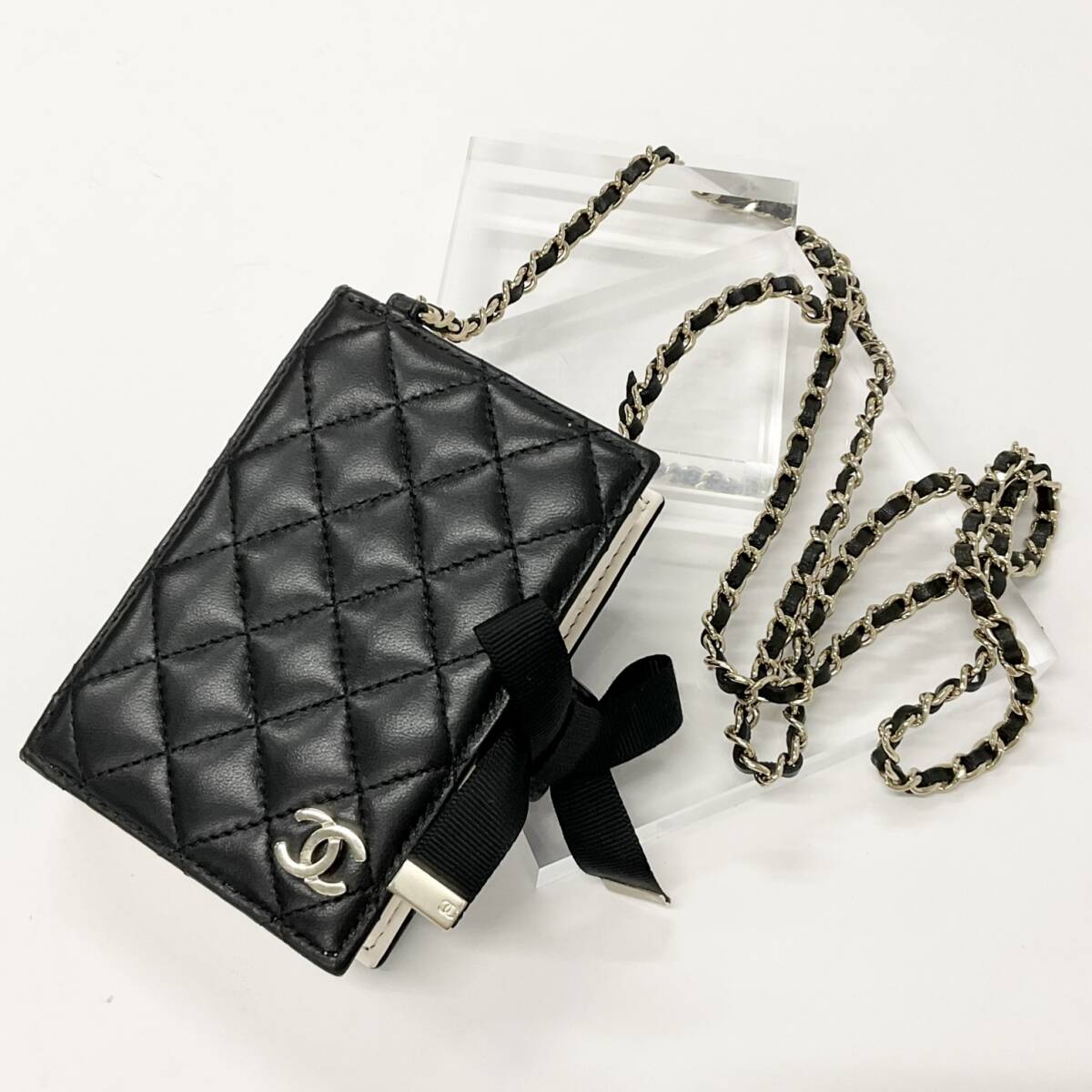 - M11649 シャネル ココマーク ロゴ マトラッセ カードケース チャーム ラムスキン ショルダーチェーン ブラック
