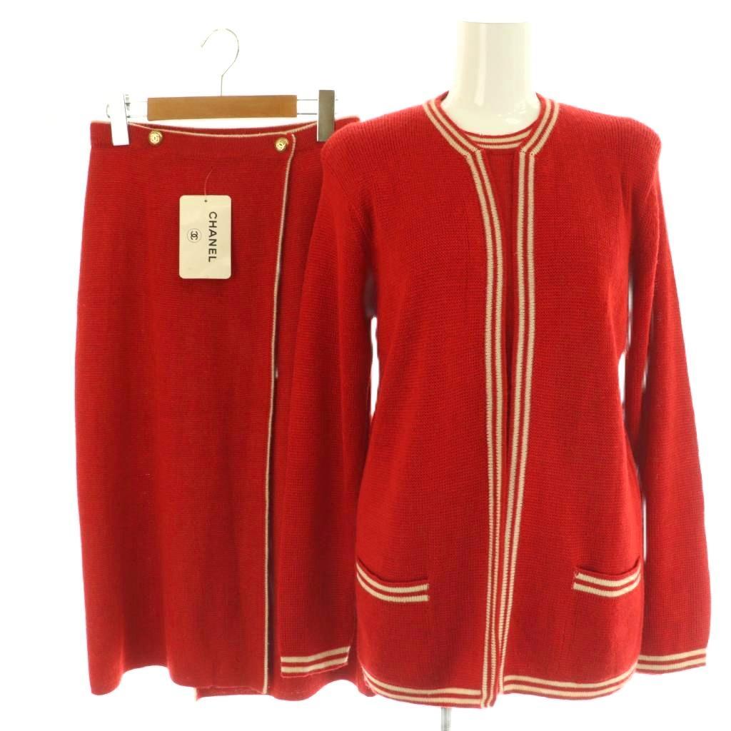 > シャネル ヴィンテージ ラインデザイン ニット3ピース セットアップ アンサンブル カーディガン セーター スカート ロング S M 赤
