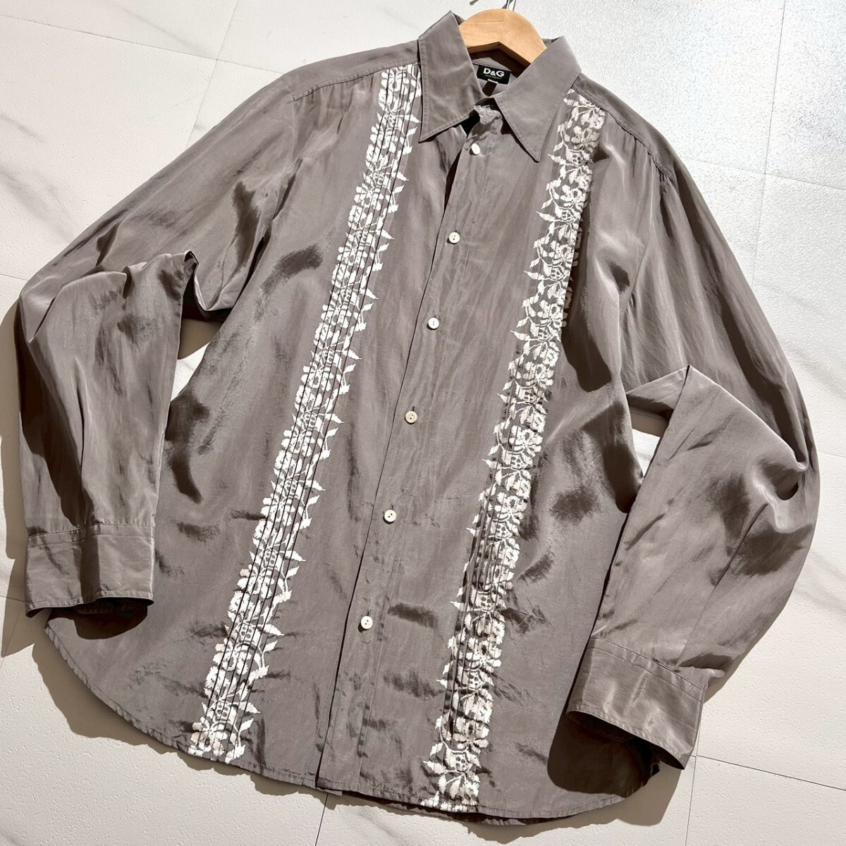 > 美品●ドルチェ&ガッバーナ D&G シルク混 シャツ デザイン 長袖 メンズ ラグジュアリー ホログラム DOLCE&GABBANA ドルガバ グレー M~L