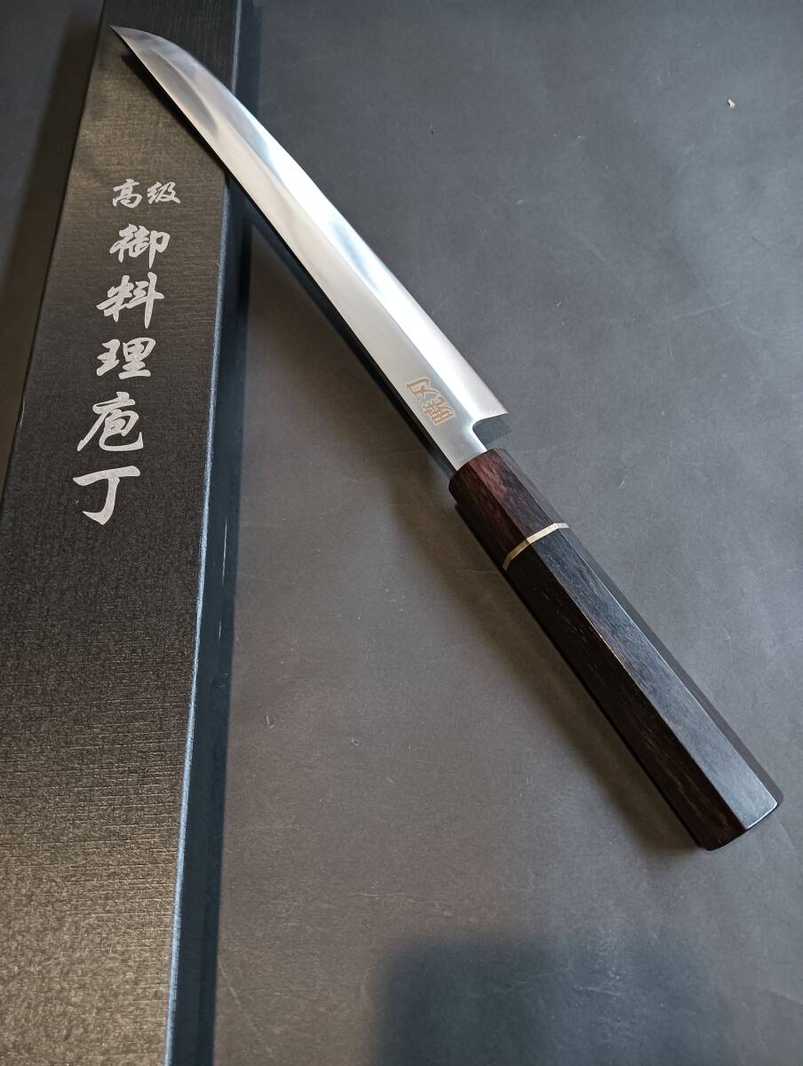 - 暁刃刃物 ステン本焼V金10号先丸柳刃包丁270mm高級黒檀八角柄