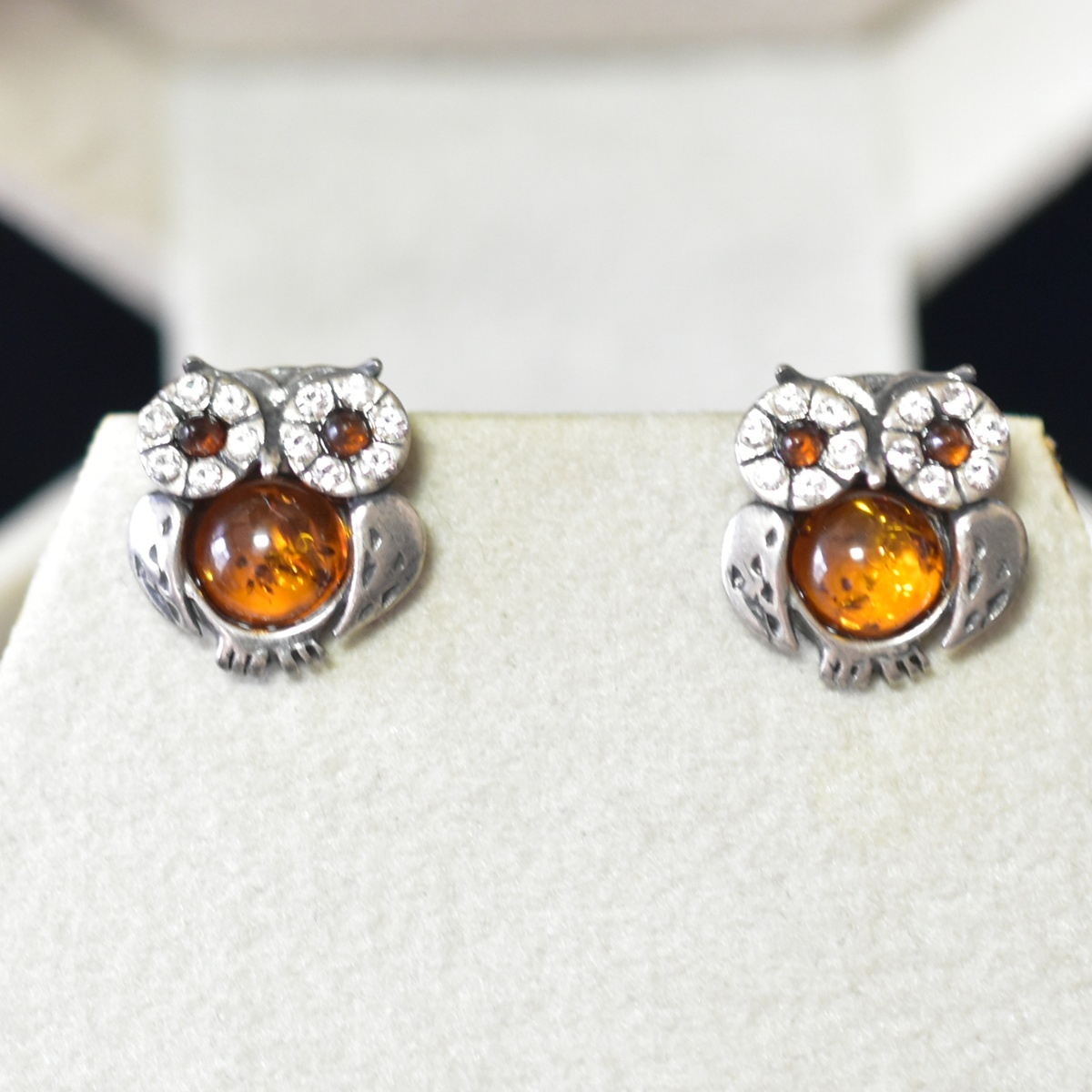 > アンティーク ハンドカット古ガラスと琥珀 バルティックアンバーのふくろうの純銀製ピアス 梟 不苦労 キャッチ付き 本物保証