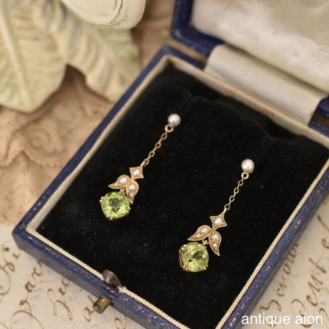 - 英国アンティーク 19世紀後期-20世紀初期 15ctゴールド 天然ペリドット&天然シードパールのピアス