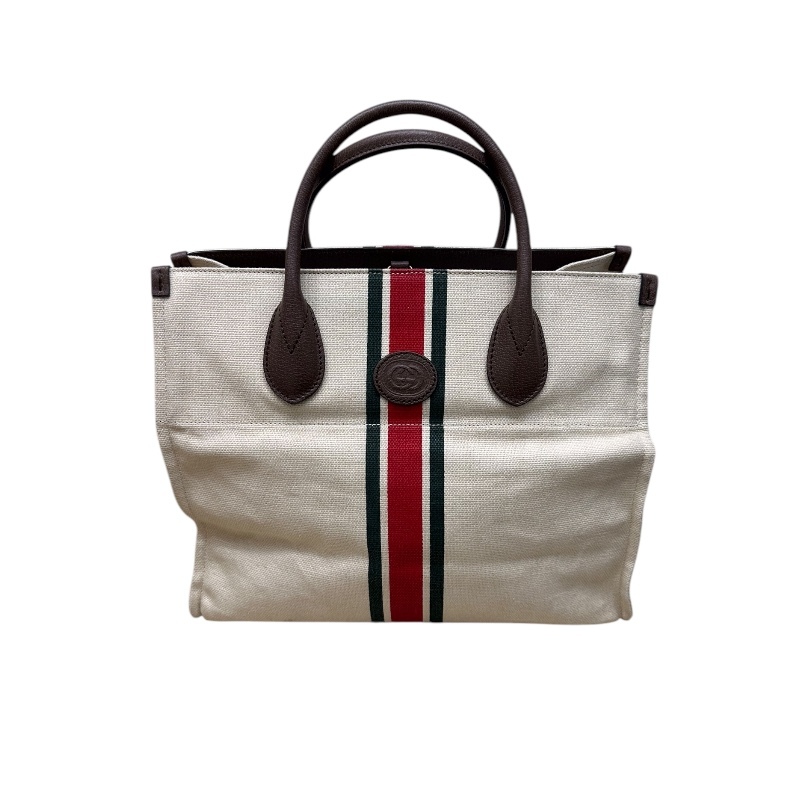 - グッチ GUCCI シェリーライン フォールダブル スモールトート ベージュ キャンバス レザー ハンドバッグ ユニセックス 中古