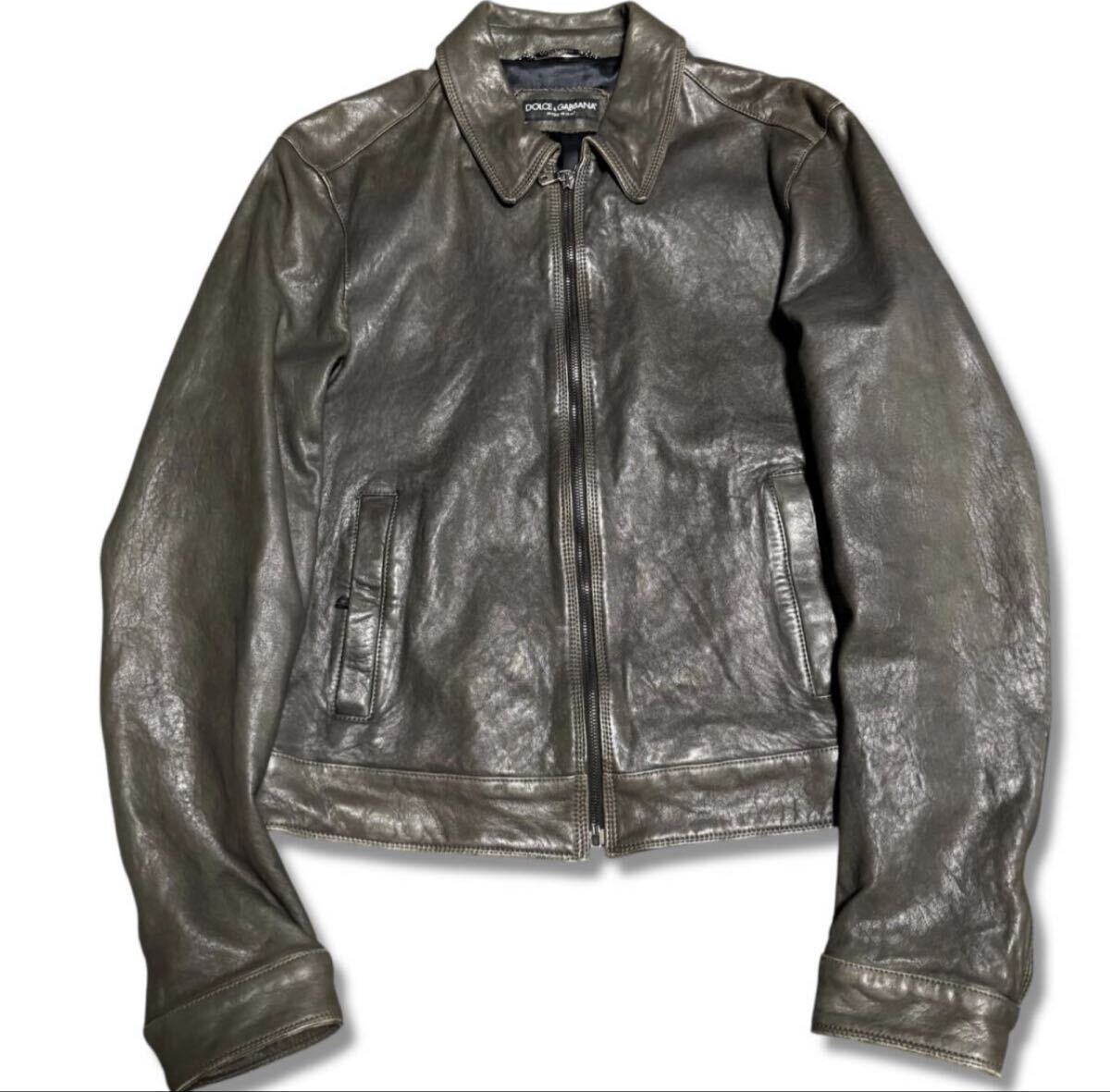 > DOLCE GABBANA レザージャケット ライダース ドルチェ ガッバーナ ドルガバ ブルゾン ダークカーキ ユーズド加工