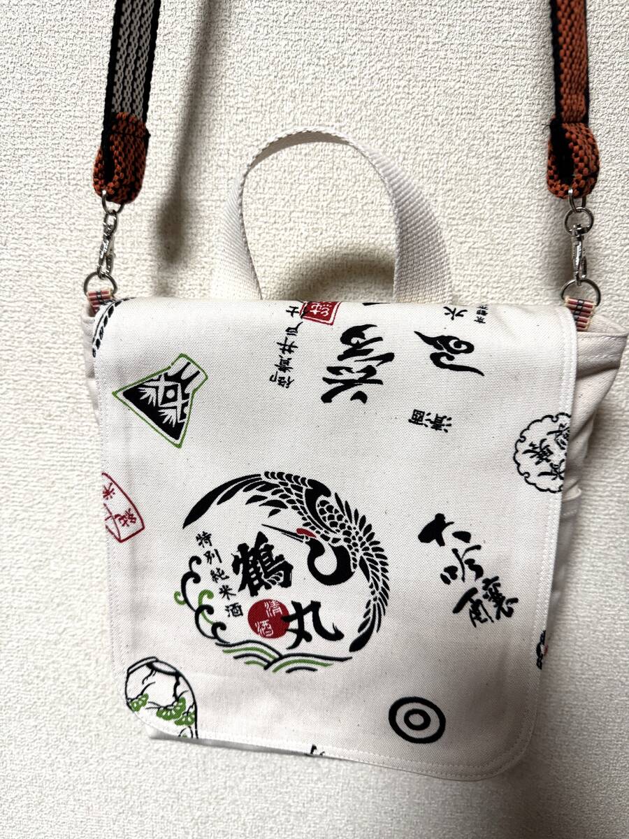 - ハンドメイド サコッシュ ショルダーバッグ 4ポケット / 11号帆布 真田紐 前掛け紐 / 和柄 酒柄 WAGARA