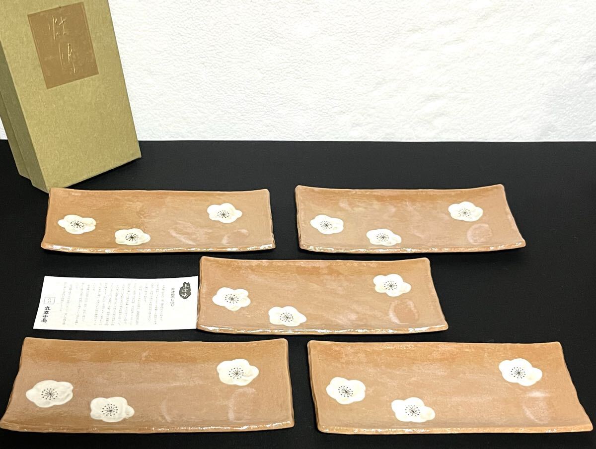 - 赤津焼 師 白梅 梅三彩 突出皿揃 角皿 長皿 和食器 小皿 陶器 食器 5枚セット/未使用 丸幸中島
