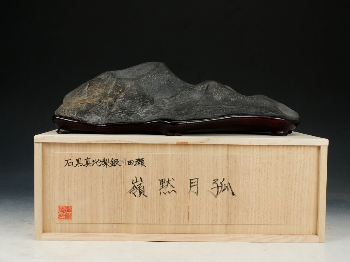 > 【ISBS】瀬田川銀梨地真黒石(台座箱付)銘「孤月黙嶺」梨地 ウブ 山型 鑑賞石 水石 横幅約36.2㎝×奥行約14.3㎝×高さ約11.0㎝[Y2026033006]