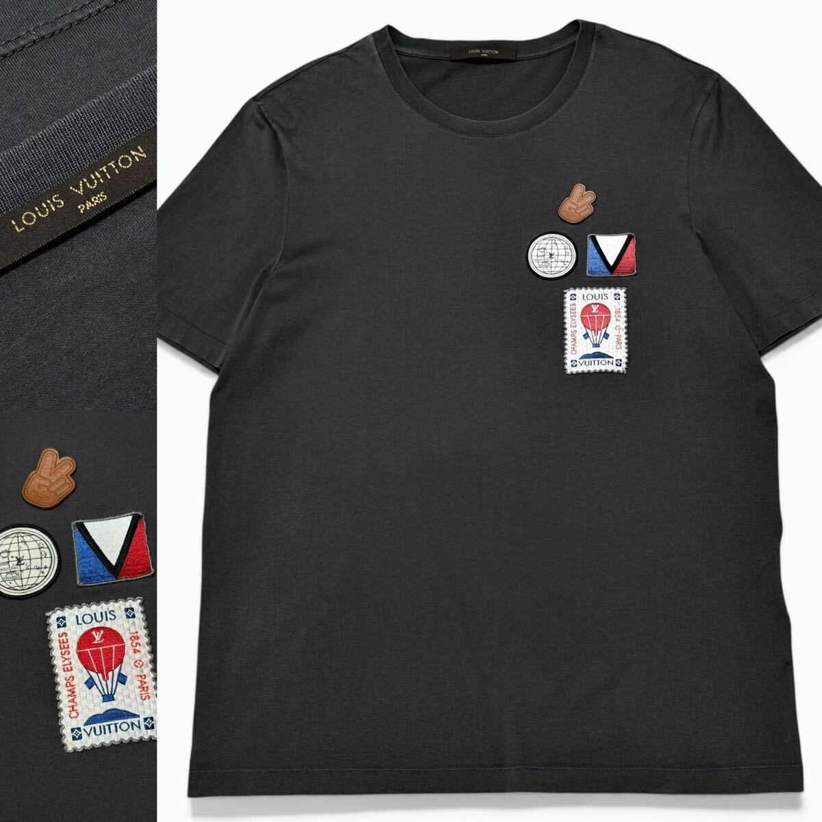 > 極美品/XLサイズ●LOUIS VUITTON ルイヴィトン ロゴワッペン付き クルーネック 半袖 Tシャツ イタリア製 ダークグレー メンズ 正規品 春夏