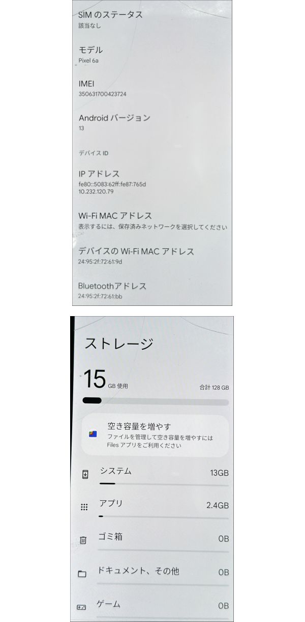 > 2603M4304 Google グーグル Pixel 6a 128GB 通電確認済 IMEI KDDI:〇判定 SIMフリー 通電確認済