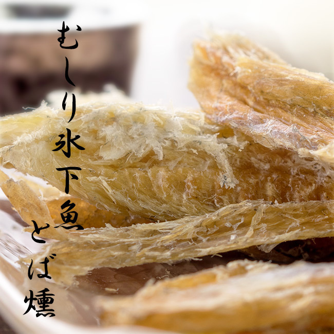 > むしり氷下魚のとば燻65g(淡白な身のコマイの珍味)叩いて開いてちぎっての作業が不要のむしりこまい(ほのかに甘く香ばしいむしりカンカイ)