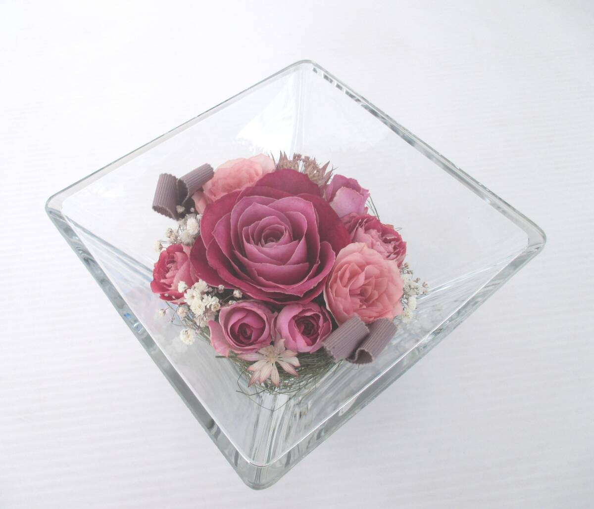 - プリザードフラワー ガラスケース入り バラ ミックス お花 ピンク インテリア 飾り用などに☆ボトルフラワー