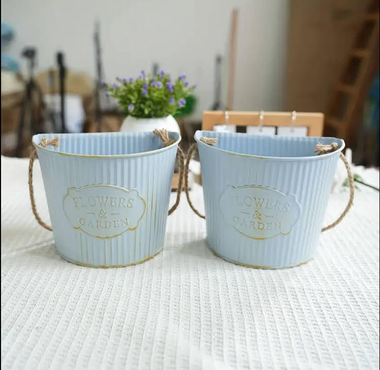 - ■新品■ガーデン【フラワーポット】 ブルー プランター 【2個セット】ヴィンテージ【ブリキ】鉢 アンティーク 花 庭 ガーデニング