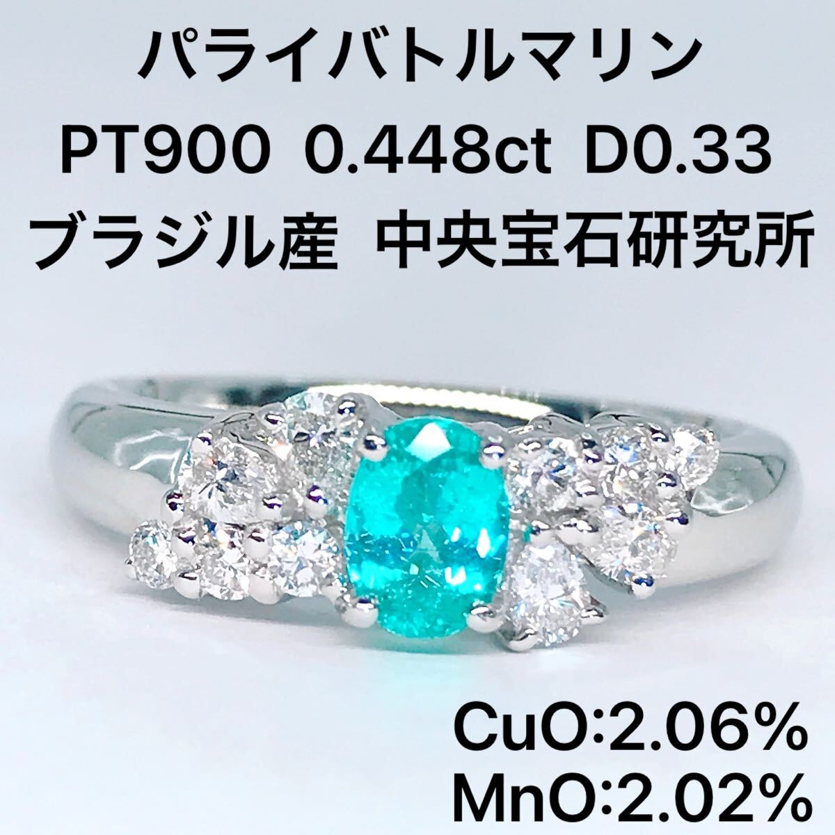 > パライバトルマリン 0.448ct ダイヤモンド 0.33ct リング PT900 ブラジル産 ネオンブルー 鑑別書 中央宝石研究所 Paraiba Tourmaline