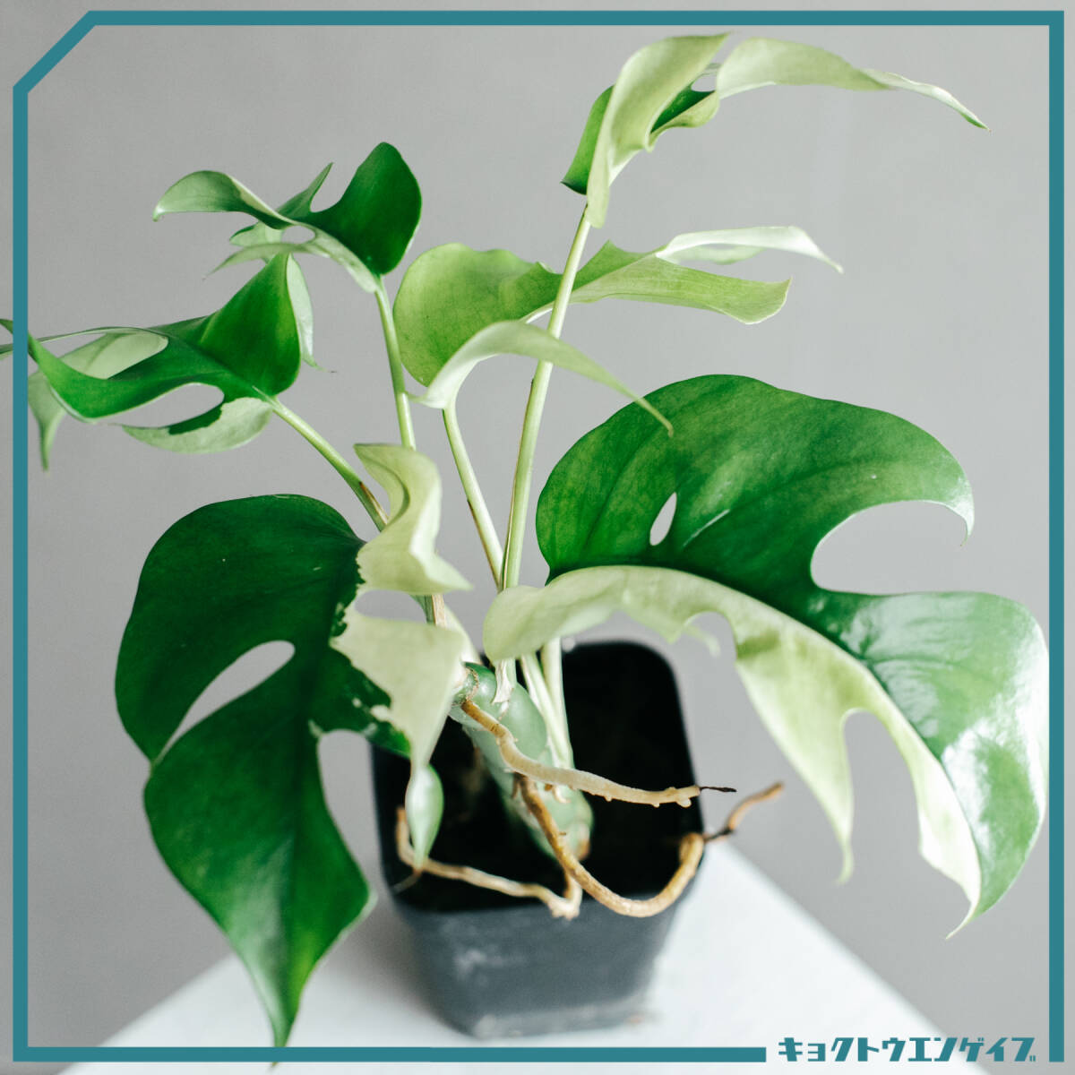 モンステラに似た小ぶりな切れ込み葉が愛らしいヒメモンステラの斑入り品種。深みのあるグリーンの葉にクリーム~ホワイトの斑が不規則に入り、通常のヒメモンステラとは一線を画す華やかさを持ちます。斑の入り方は株によって様々で、細かいスプラッシュ斑からハーフムーン、大きなホワイトセクションまで多彩なパターンが楽しめます。コンパクトなサイズ感ながら存在感は抜群で、インテリアグリーンとしても高い人気を誇ります。つる性でよく伸びるため、ハンギングや支柱仕立てなど多彩なスタイルで楽しめます。明るい間接光を好み、直射日光は葉焼けの原因となるため避けてください。