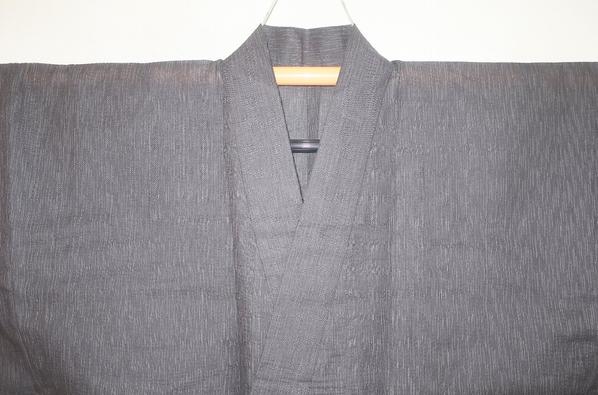 | | こちらのお品は、遠州織の綿麻にポリエステルが混紡になった新しい織の単衣の着物、新しじら織です。状態は生地から仕立てた新品です。そのためミシンだけで仕立ててありますので襟芯はなく、襟つけや背中心の縫製が少し粗い感じですが、稽古や浴衣程度であれば、如何でしょうか。透かし織でところどころ透いたような織が涼しげな通気性のいい織地です。縫いの手法が気になる方は避けてください。長襦袢をつければ単衣に、つけなければ浴衣になります。今回は地色はグレー地で五月雨縞の涼し気な織と色です。色味が難しいため現物優先でお願いします。男の夏の着物、高級色は芭蕉色ですから、如何でしょうか。以前のしじらよりシワになりにくくなりました。サービス出品につき同梱できません。 | |