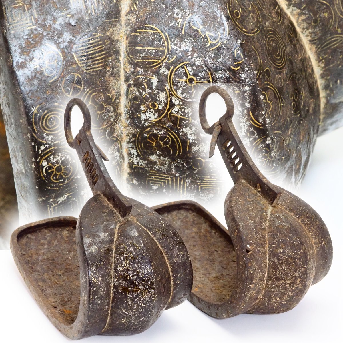 - 【治】時代馬具 金象嵌鉄地鐙一対☆幅 29cm (検索:乗馬 馬術 鞍 武具 青貝 螺鈿 鎧 鐙 刀装具 馬具 騎馬 甲冑 競馬 古民具) BCT14