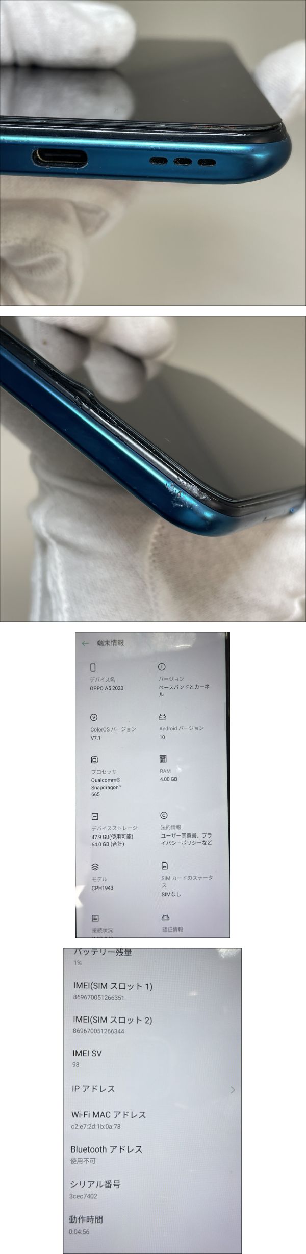 - 2603M4220 OPPO オッポ A5 2020 CPH1943 64GB IMEI 楽天モバイル:〇判定 SIMフリー 通電確認済