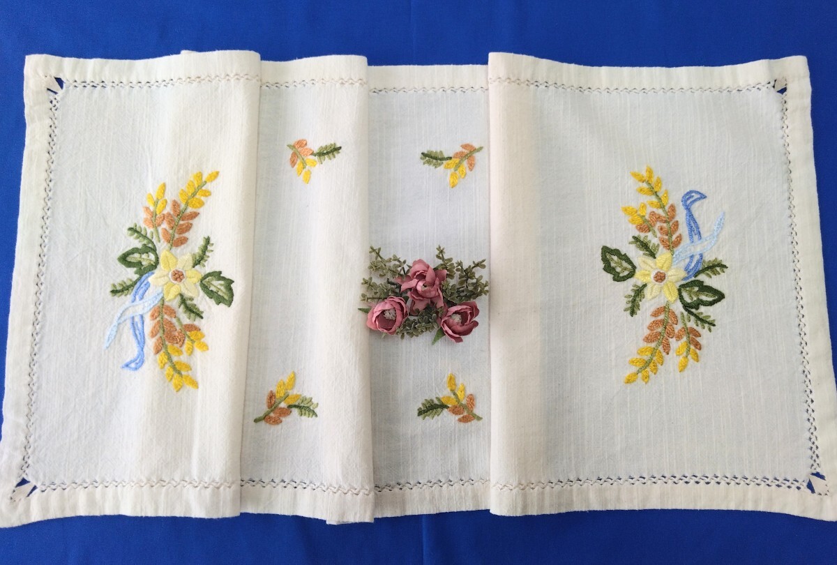 - フランス 骨董市 ブロカント エクリュ色の生地に気品のある素敵なお花のブーケの手刺繍をあしらったテーブルセンター