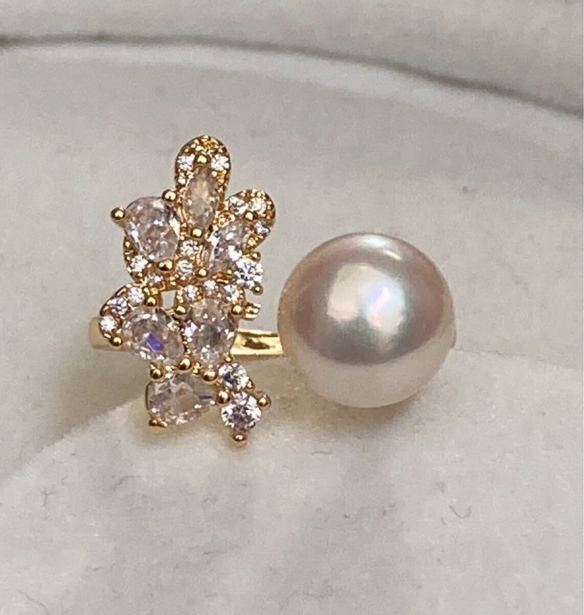- ツヤツヤ真珠リング パール指輪 本真珠 ホワイト キラキラCZ付き フリーサイズ