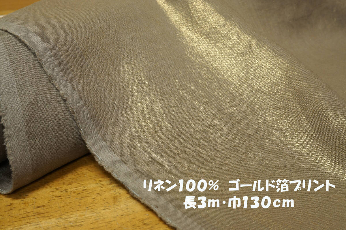 > リネン100% ゴールド箔プリント 中厚~微薄コシ光沢 長3m巾130㎝ ワンピース プルオーバー スカート ワイドパンツ シャツ バッグ 小物