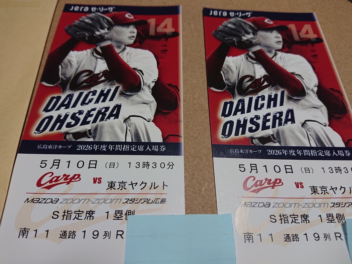 > 広島カープVS東京ヤクルト 5月10日 日曜日 S指定席 並び2枚 一塁側 南11 通路19列 デーゲーム