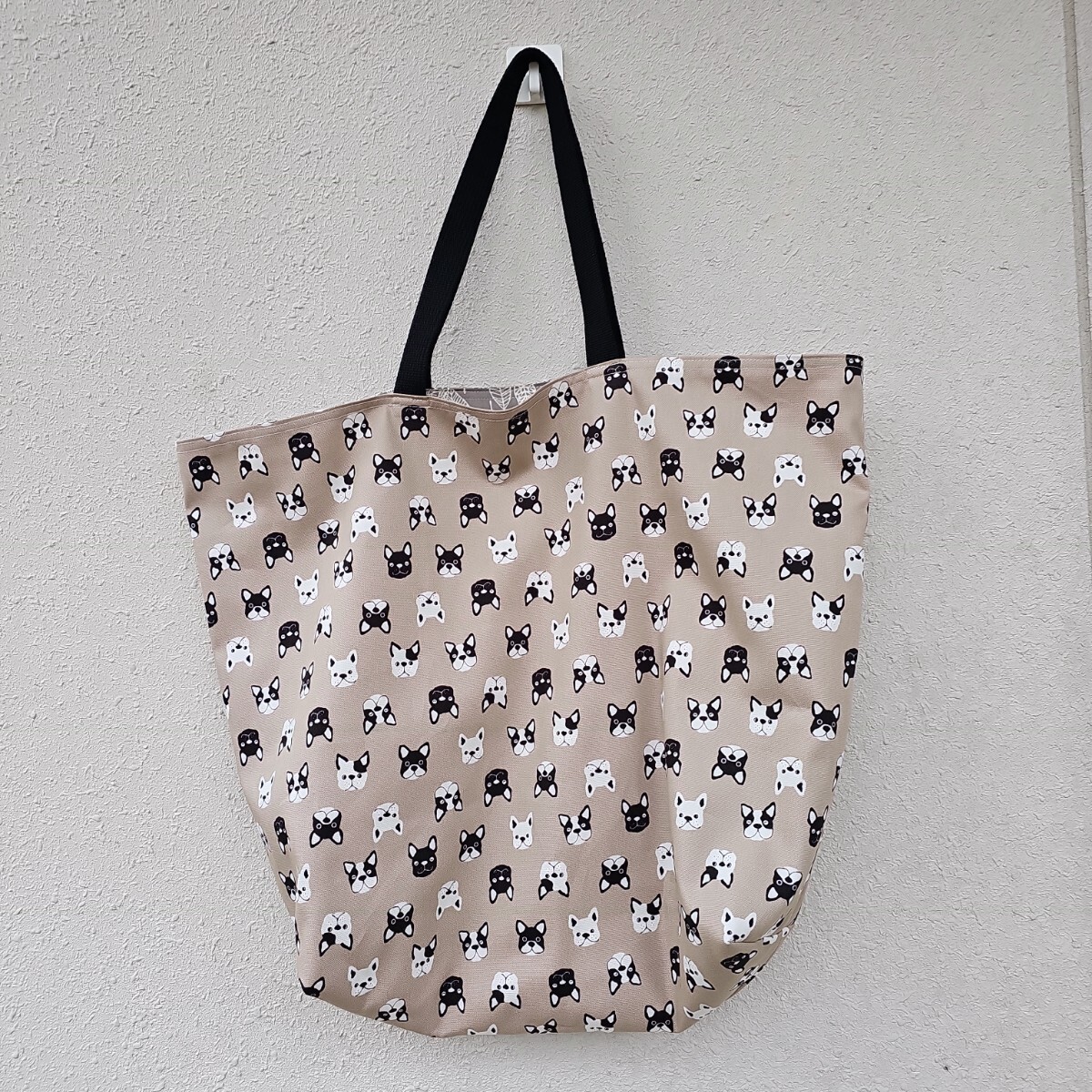 - 即決 送料込 ハンドメイド 綿コットン オックス生地 犬イヌ フレンチブルドッグ ベージュ エコバッグ 布カバン トート 大容量 持ち手黒