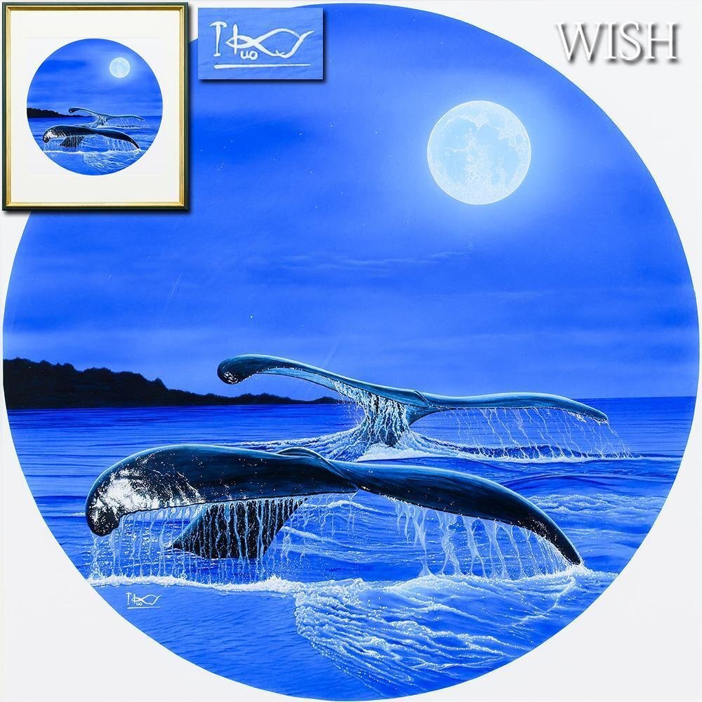 > 【真作】【WISH】戸川郁夫 ボードにアクリル画 8号大 ◆月光に包まれるクジラと海 〇マリンアート作家 伊勢丹個展等 #26033070