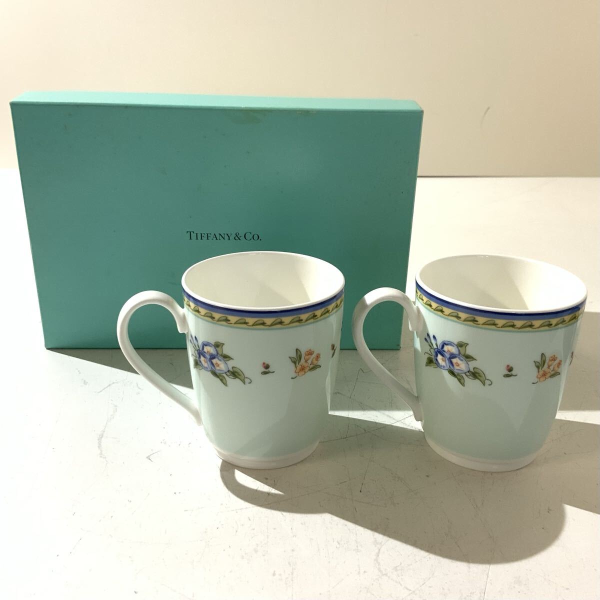 > 【保管品】TIFFANY&Co. ティファニー マグカップ 2客セット MORNING GLORY モーニンググローリー ライトブルー系 陶器 洋食器 箱付き