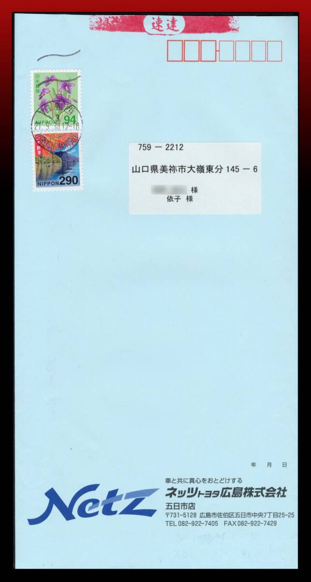 - H80 速達290円最終日印|日光290円スミレ94円/速達290円定形重量書状94円 新和欧文機械印:広島西/3/21.9.30.12-18 定形外発送※ エンタ