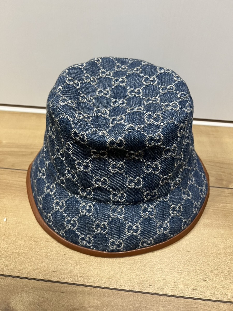 > GUCCI グッチ GGデニム バケットハット レザートリム 576371 4HAC3 L 59cm インディゴ 帽子 美品