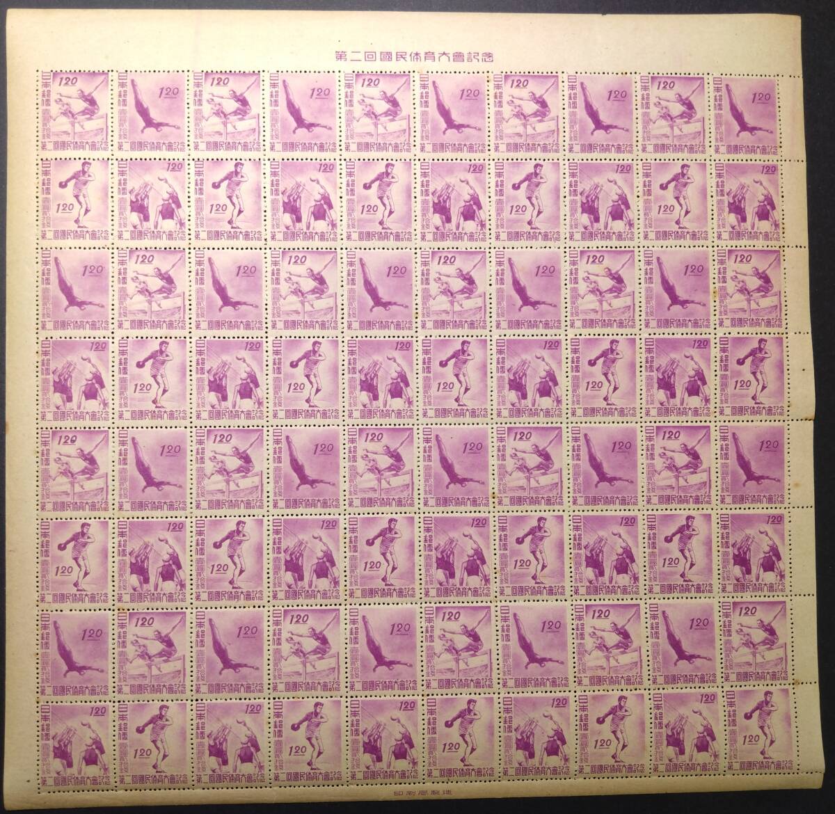- 記念切手【第2回 国体 1円20銭切手 80面1シート】裏面のりアリ 未使用 カタログ価格280,000円 国民体育大会