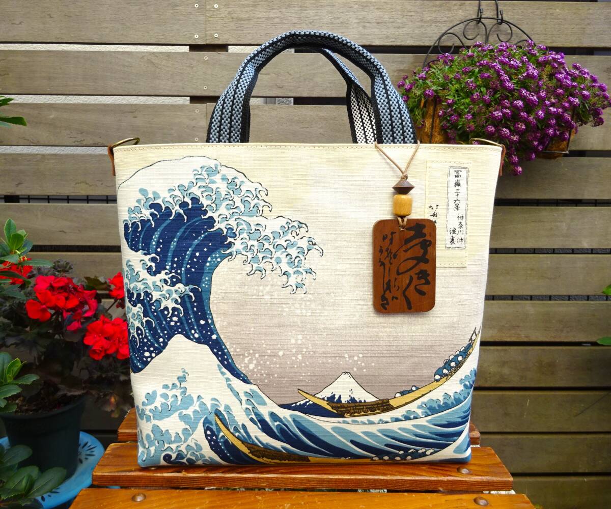 - ◆送料無料◆葛飾北斎『神奈川沖浪裏』浮世絵 トートバッグ 大サイズ■おまけ木札 底板&Dカン&ファスナー引手飾り付 手作り&オリジナル