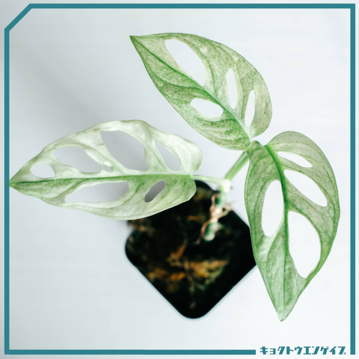 無数の窓孔が個性的なマドカズラの斑入り品種で、ミントグリーン~クリーム色の柔らかな斑が葉全体に広がる幻想的な美しさが魅力。通常のマドカズラと比べ、斑の淡いトーンが株全体を優しく上品な雰囲気に仕上げます。斑の入り方は一枚ごとに異なり、同じ表情の葉が二枚とない点もコレクターを惹きつける理由のひとつ。つる性で生長するため、ハンギングや支柱仕立てなど様々なスタイルで楽しめます。斑入り品種のため直射日光は葉焼けの原因となりますが、明るい間接光を確保することで美しい斑を長く維持できます。