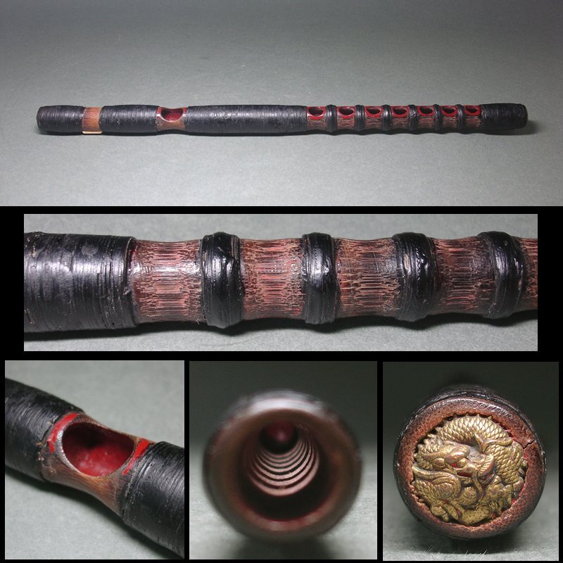- 慶應◆江戸時代 雅楽器 能管 煤竹・樺巻造 頭金は金銅龍図(和楽器横笛龍笛高麗笛篳篥神楽笙