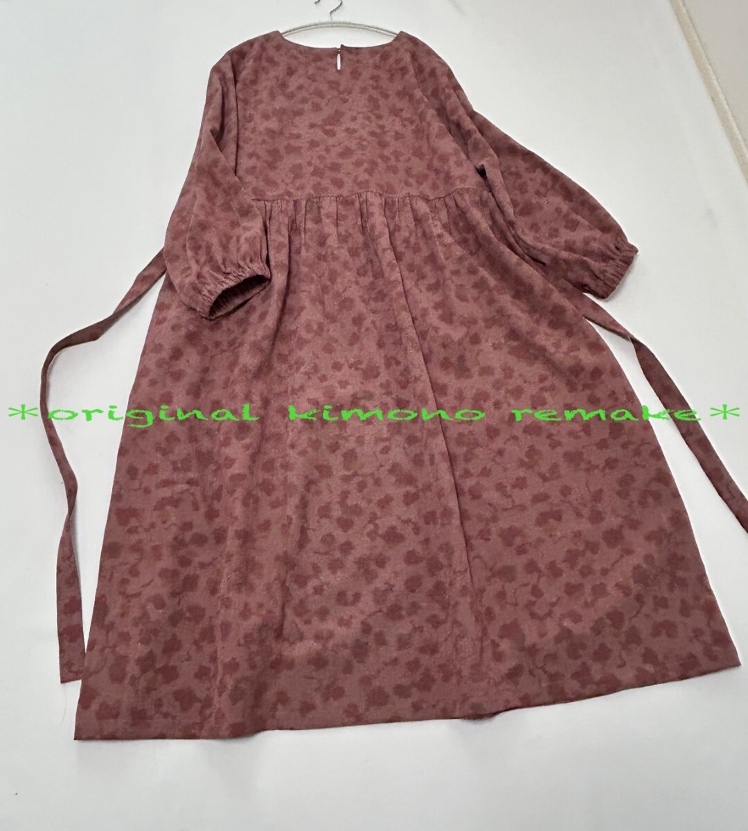 - ピンク系小紋★ギャザー切替えワンピース★着物リメイク★紬ワンピース★ハンドメイド★パフスリーブ★