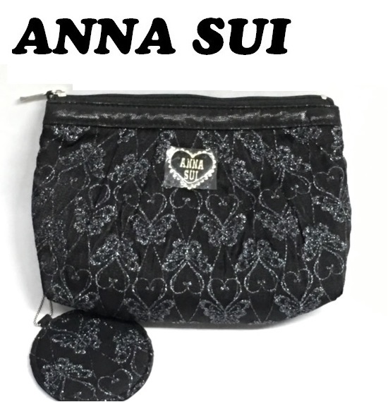 - 【ANNA SUI】(NO.2084)アナスイ コスメポーチ ミニミラー付き ブラック ラメ入り蝶刺繍 未使用