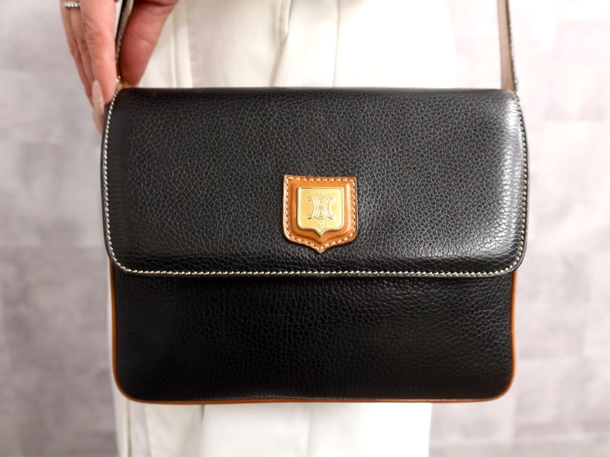 > ●超美品●CELINE セリーヌ●ロゴ金具●カーフ レザー 本革●ショルダー バッグ●黒 キャメル●ゴールド金具●肩掛け●かばんJs66425