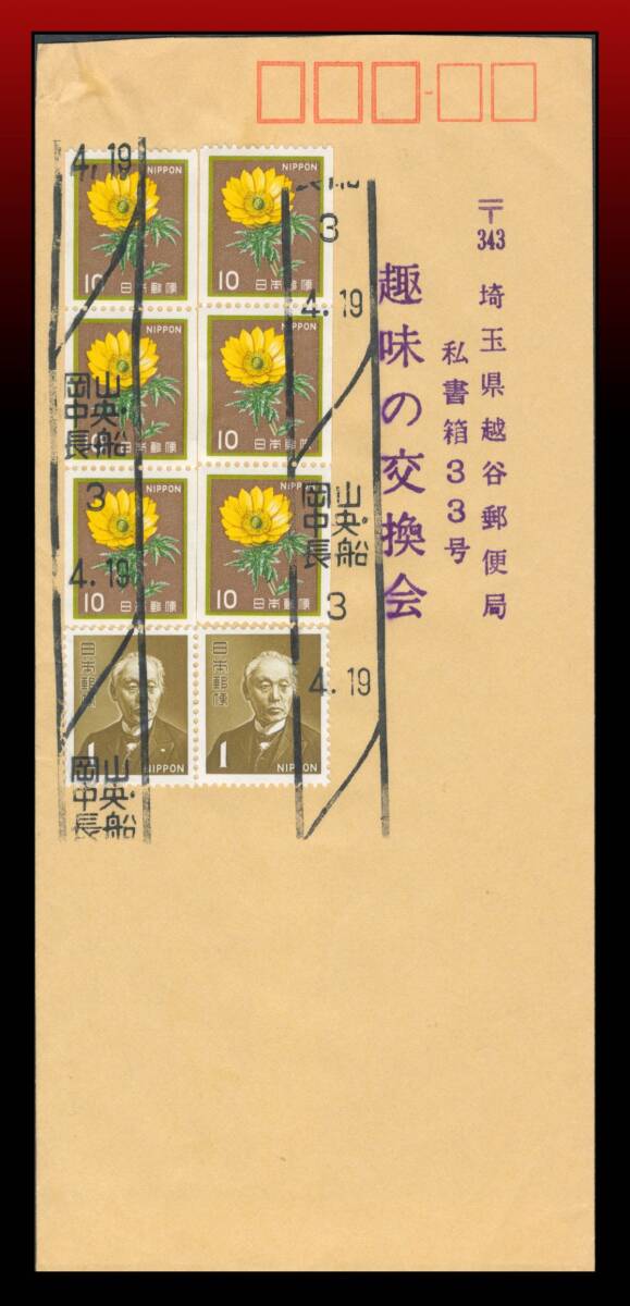 - H78 分室印/黒色最終日印/コイル|福寿草10円6枚新前島1円2枚/書状 新ローラー印:岡山/中央・/長船/3/4.19 エンタイア