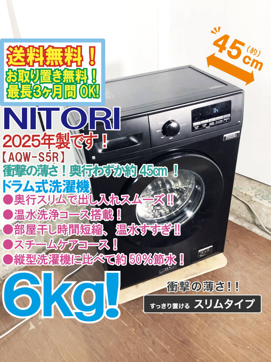 > 送料無料★2025年製★極上超美品 中古★NITORI 6kg 衝撃の薄さ!奥行わずか約45cmのスリム★ドラム式洗濯機【ND60UL1BK】FUR2
