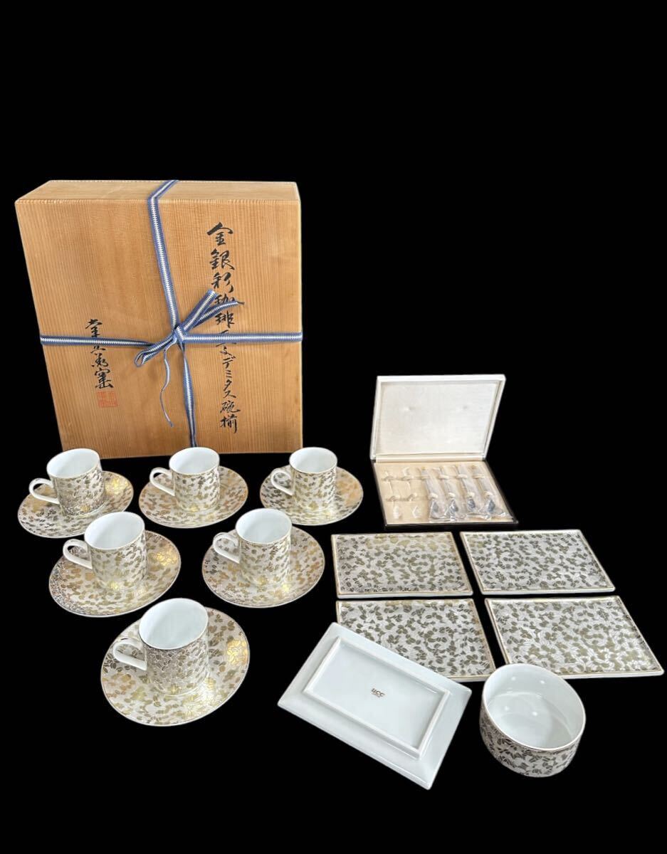 > 【O32-32】加藤幸兵衛窯×UCC 金銀彩珈琲豆デミタス碗揃 珈琲碗皿 カップ&ソーサー 6客 角皿6枚 共箱付 未使用 豪華セット 伝統工芸