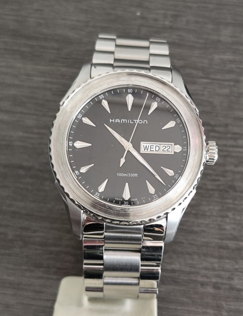 > 稼働品 ハミルトン メンズ腕時計 黒色文字盤 三針デイデイト オリジナルバンド ベゼル欠品 HAMILTON