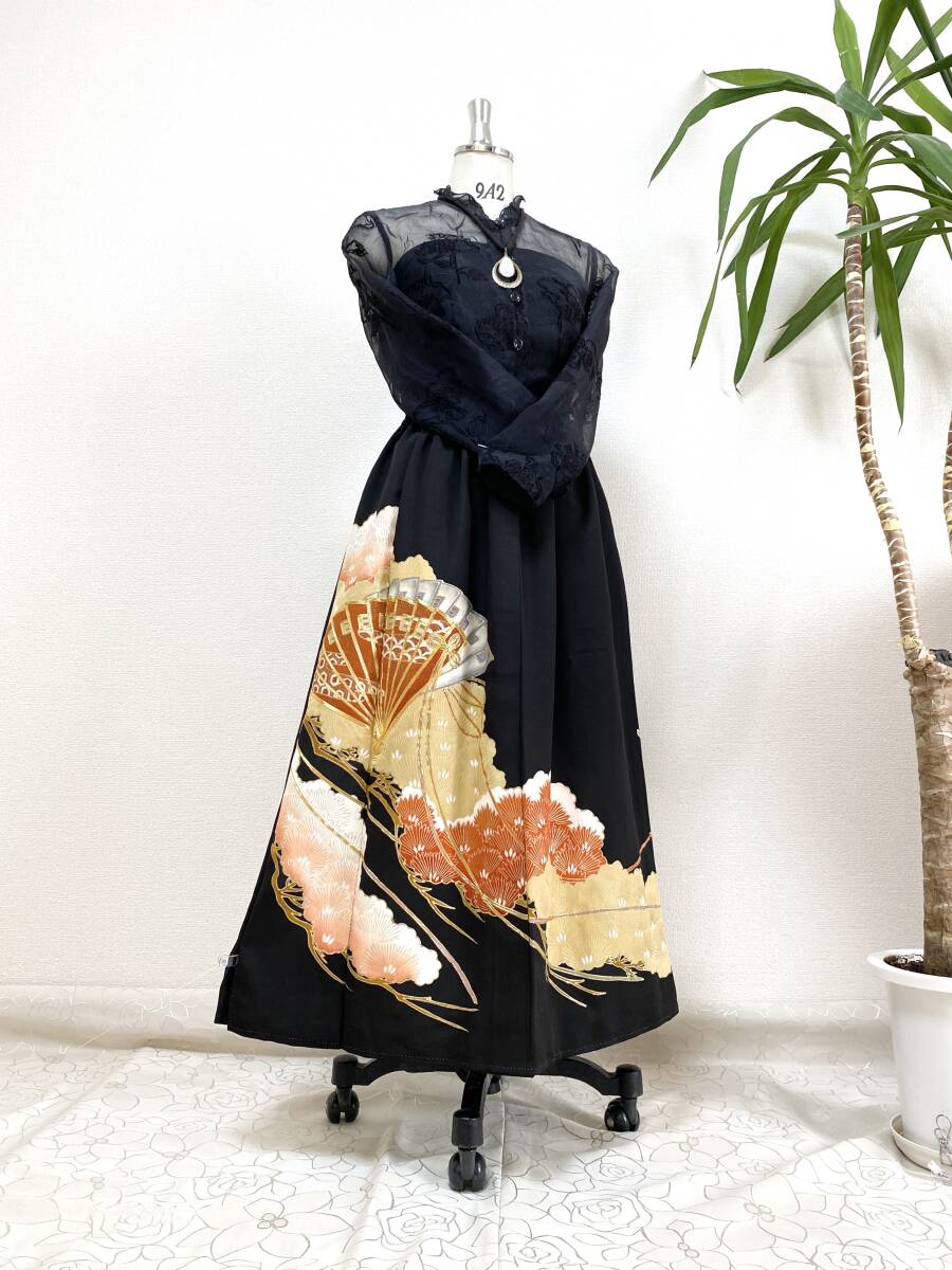 - 大人可愛いセレブ着物スカートフリーサイズ黒留袖着物リメイクウエストゴムロングスカート送料込みハンドメイドNO.6167