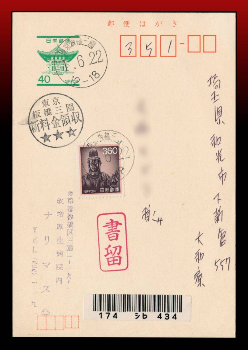 - H74 書留葉書|鐘楼40円葉書(裏横罫線入)+観音360円+新料金領収印/書留360円 丸型印:東京・板橋三園/1.6.22/12-18※局名は領収印〜 エンタ