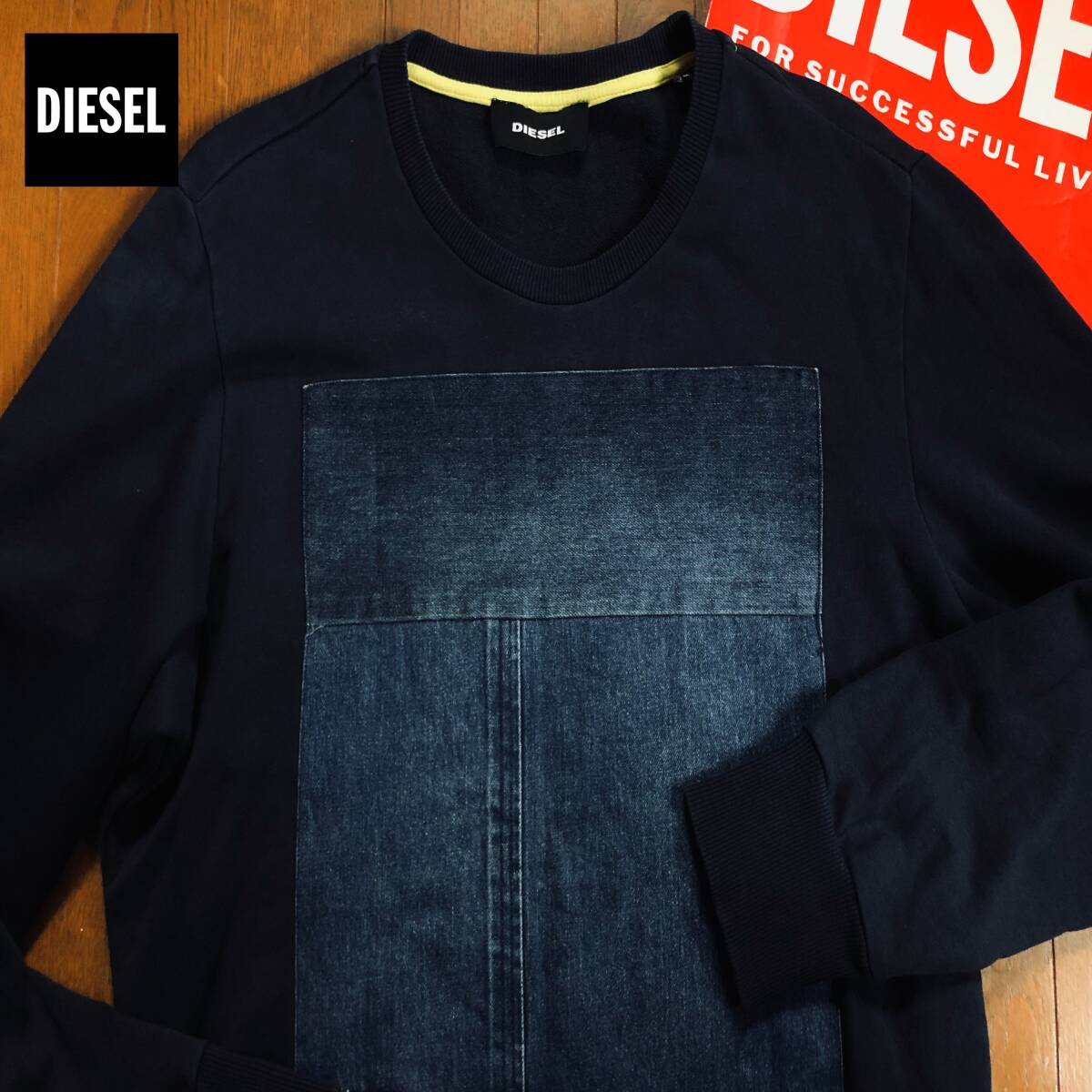 > ●サイズL〜XL程 極上 DIESEL ディーゼル ウォッシュ デニム フロント パッチワーク スウェット 濃紺 メンズ 即決 即納 55dsl y2k●2014